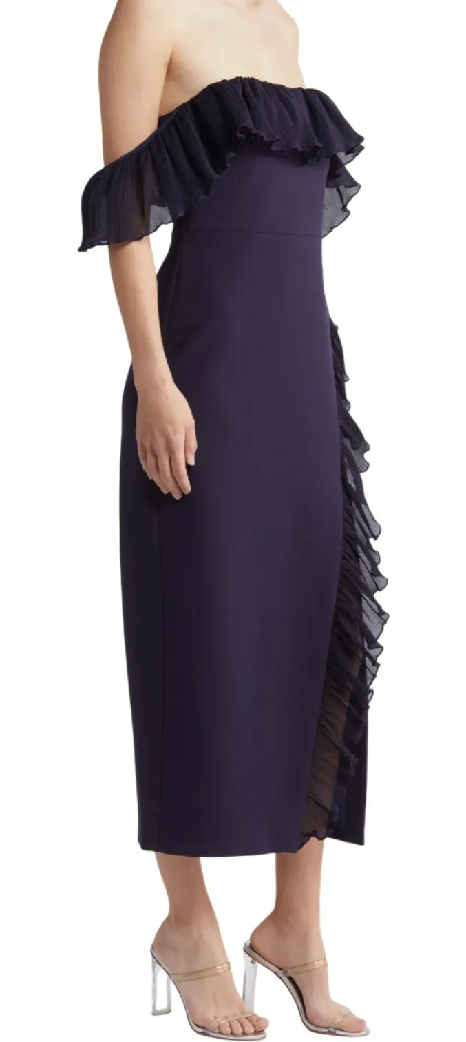 Likely Aldave Off the Shoulder Sheath Dress Pre-Owned in Great Condition Approximate Measurements: • Waist: 32 in • Bust: 36 in • Hips: 38 in • Length: 42 (Body) Captivate with this striking navy blue midi dress, designed to make an unforgettable impression. A cascade of delicate ruffles gracefully adorns the off-the-shoulder neckline and sweeps across the hip, creating a dynamic and romantic silhouette. The flattering fit and elegant midi length ensure sophistication for any special event. Perfect for formal dinners, elegant weddings, or a sophisticated cocktail party.
