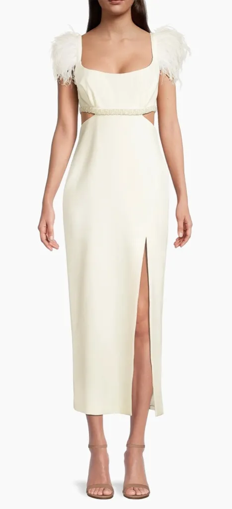 Stunning dress with feather straps, pearl beads along the cutout. Zipper closure in the back. Square... Show more