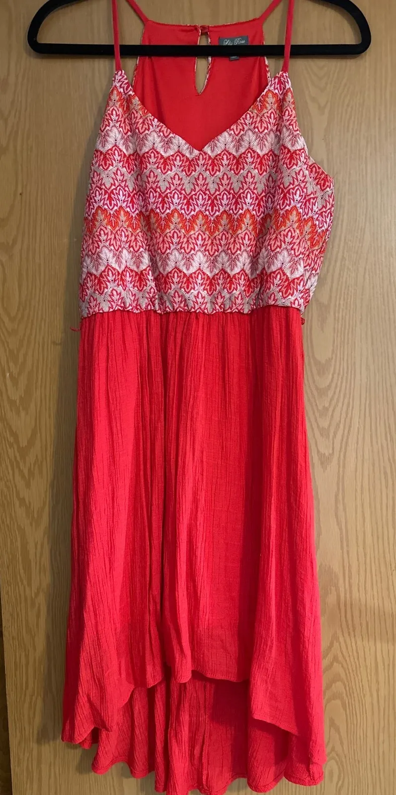 The Lily Rose Spaghetti Strap Hi-Low Sundress in red is a stylish and versatile piece for women size... Show more
