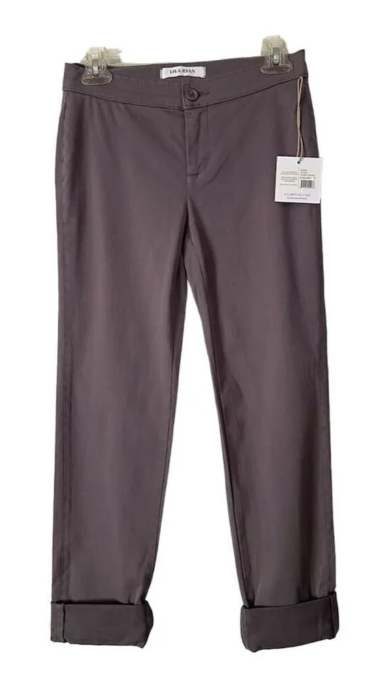 Lila Ryan Women's Midrise Tapered Pants in size 0. Color: Gray. Made from a blend of cotton, rayon, tencel, and spandex. Features include rolled cuffs, two front pockets, and a button closure. Regular fit. Suitable for casual occasions, especially in the fall. Machine washable. New with tags (NWT). Keywords: Lila Ryan, women's pants, tapered pants, gray pants, casual wear, fall fashion, size 0, cotton blend, machine washable, rolled cuffs, no front pockets, faux back pockets, button closure, regular fit, solid pattern, new with tags.
