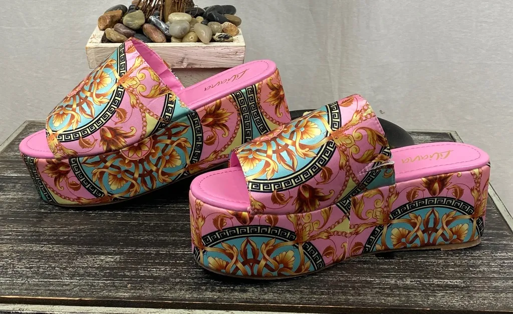 Liliana Pink & Gold Print Platform Slide Sandal Shoes 10 - $28 - From Designer
