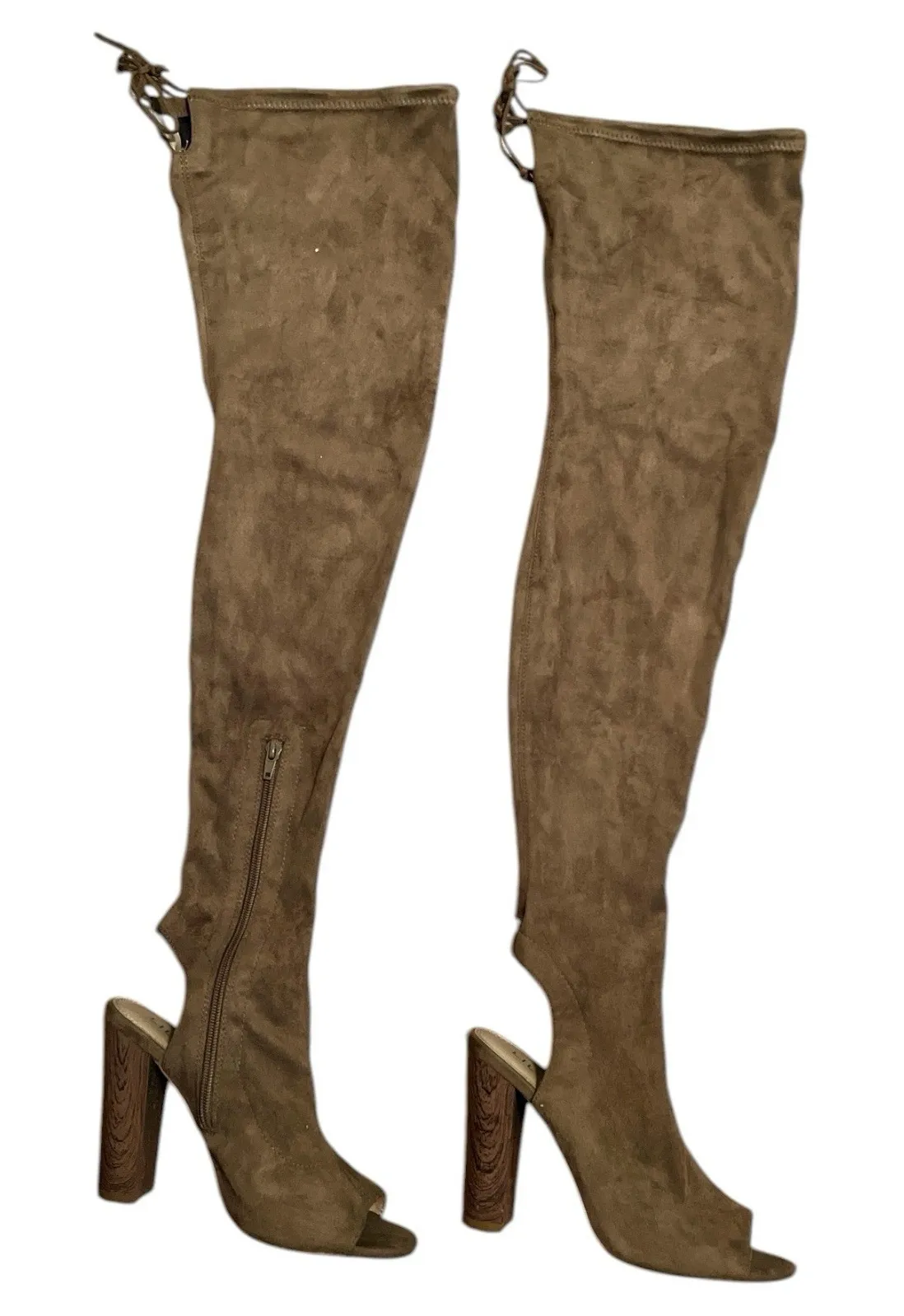 Liliana Thigh High Lace Faux Suede Brown Boots Size 8 Boho Boho Mod Streetwear Brand: Liliana Size: 8 Color: Brown Fabric: Faux Suede Measurements: 6" Calf Width 30" Length 4 1/2" Chunky Heel Style: Thigh High, Tie Lace Closure, Open Peep Toe, Chunky High Heel, Faux Suede Shoe Liliana, Lace Thigh High, Boho Chic, Street Style, Glam, Y2K, Mod Streetwear