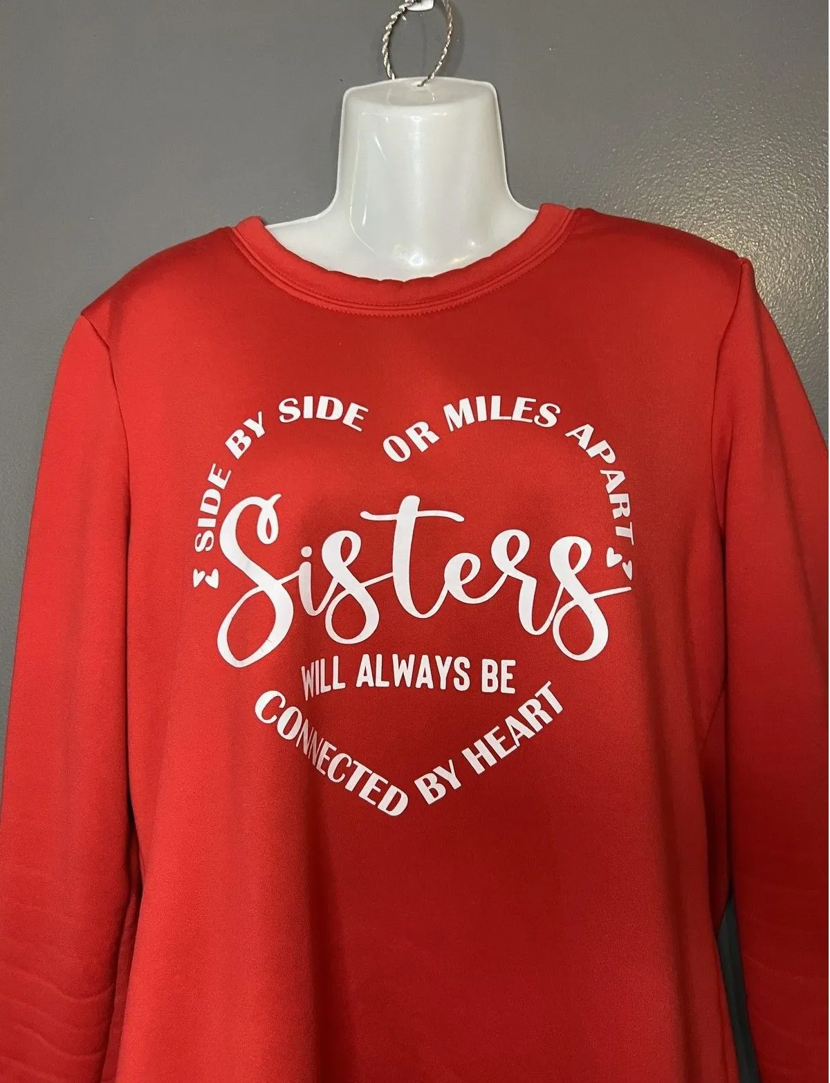 Pre-owned shirt with minimal signs of wear and light wrinkling from storage. Fabric and graphic print are clean and intact with no stains, holes, or peeling; sherpa lining shows a few stray lint fibers from storage. Interior brand and care tags present; no original retail hang tags. Brand: LILICLOTH Style: Womens long sleeve graphic tunic shirt/top with cozy fleece-lined interior. Color: Solid red exterior with white "Side by side or miles apart Sisters will always be connected by heart" front text graphic arranged in a heart shape. Material: 65% cotton, 35% polyester according to interior fabric content tag; smooth knit shell with plush sherpa-style lining. Size on tag: L (Large), womens regular sizing with relaxed fit. Design details: Crew neckline, long sleeves, tunic length body, curved shirttail hem with slightly longer back, fully lined interior for added warmth, and easy pullover construction. Origin and care: Made in China. Care tag states wash separately; professional dry clean recommended. Condition: Pre-owned shirt with minimal signs of wear and light wrinkling from storage. Fabric and graphic print are clean and intact with no stains, holes, or peeling; sherpa lining shows a few stray lint fibers from storage. Interior brand and care tags present; no original retail hang tags. PTP 22" Length 29" bin 48 2719