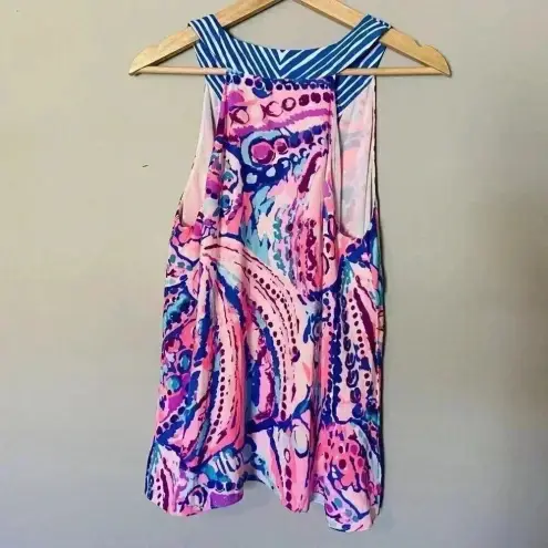 This Lilly Pulitzer Achelle top in Colony Coral Shell Out is perfect for any occasion, whether you're traveling, attending a party, or just going about your day-to-day activities. The sleeveless blouse features a V-neckline and a pullover closure, with a beautiful geometric pattern in pink color.