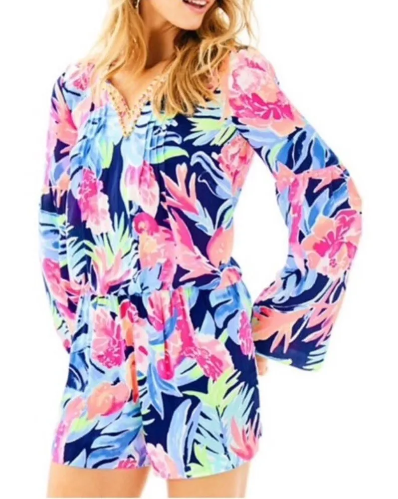 Lilly Pulitzer Ariele Romper High Tide Navy Tropicolada Floral Print Long Sleeves Studded Neckline V... Show more