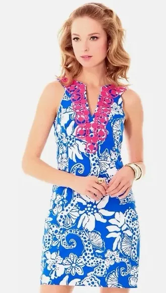 Lilly Pulitzer Blue & White Tropical Fit Flare Dress Hot Pink Lace Trim | Size 2 - $16 - From Metsky