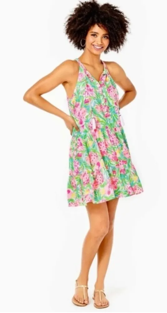 Lilly Pulitzer Caroline Lileeze vibrant pink green and yellow floral and fruit print halter dress. M... Show more