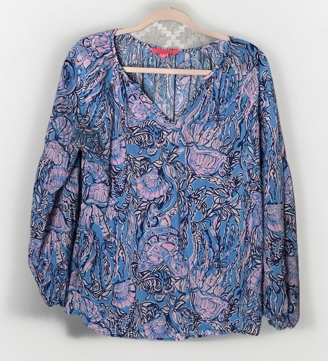 Style: Charleigh Top Size: Women's Medium Color: Pink & Blue Neckline: V-Neck Sleeves: Balloon Sleev... Show more