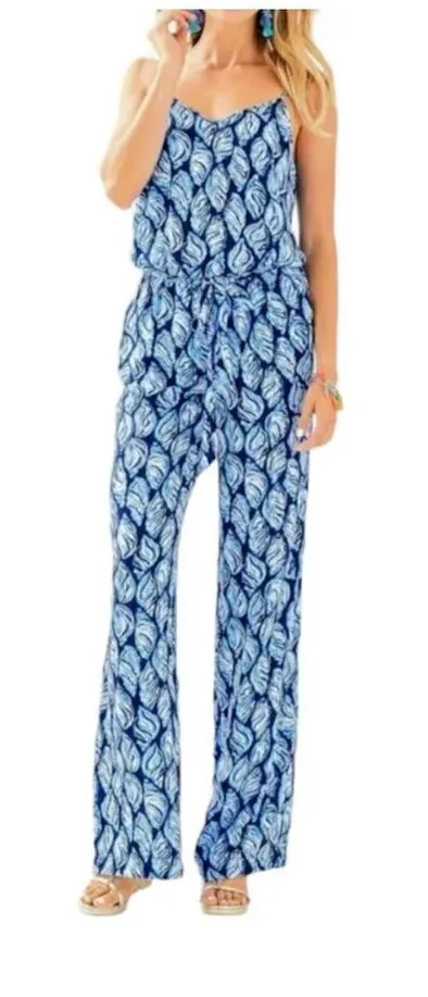 Lilly Pulitzer Dusk High tide jumpsuit Medium Navy Conch shell pattern Elastic waist with tie belt 1... Show more