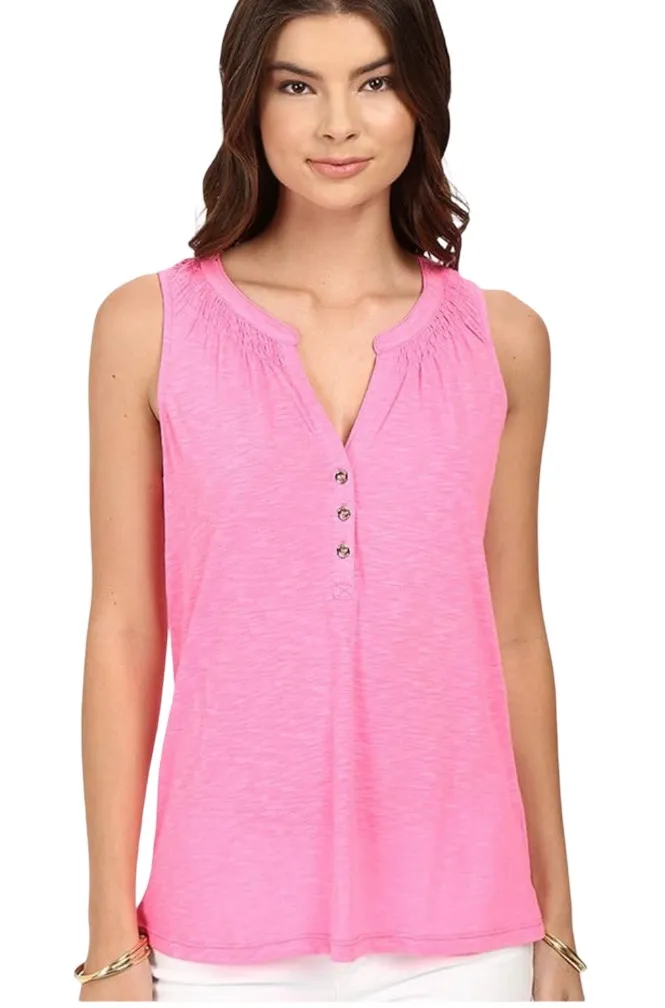 Lilly Pulitzer ESSIE Tiki Pink Chic Cotton Blend Sleeveless Top Size Large Smocked V-Neckline Detail... Show more