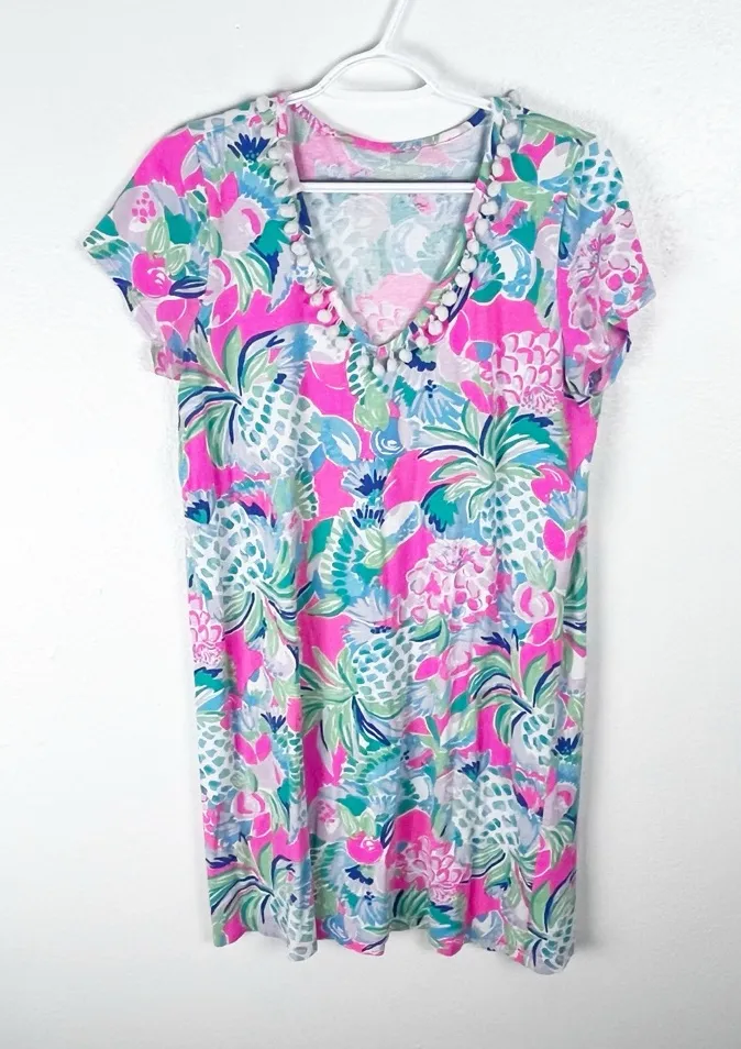 LILLY PULITZER Etta Raise The Bar Multicolored V-Neck Short Sleeves Pom Pom Trim Dress Size Large. N... Show more