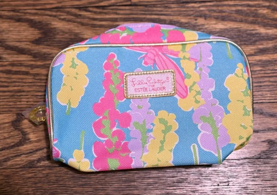 Charming floral bag by Lilly Pulitzer for Estée Lauder. Features pink, yellow, and blue floral patte... Show more