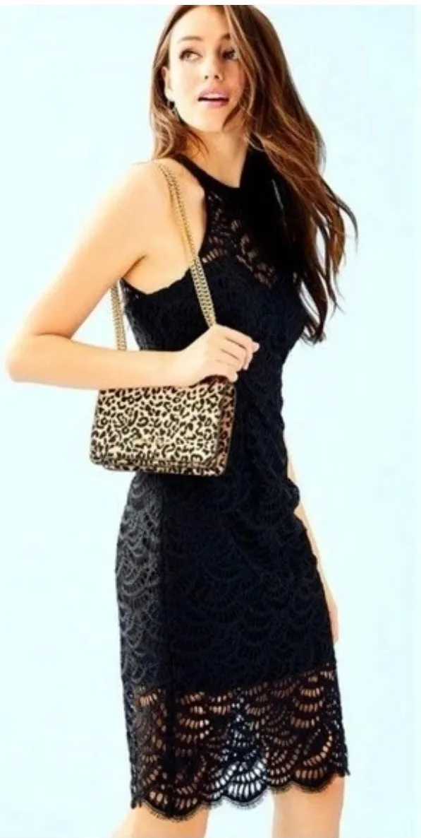 Keywords: Lilly Pulitzer dress, black lace dress, halter neck dress, sheath dress, cocktail dress, party dress, evening dress, elegant dress, knee length dress, designer dress, women's dress, size 2 dress, lace overlay, formal dress, special occasion dress