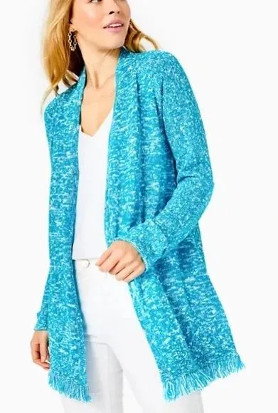Lilly Pulitzer Mavery Cardigan Turquoise Shore Marl size small. Open front, fringe hem, cotton blend... Show more