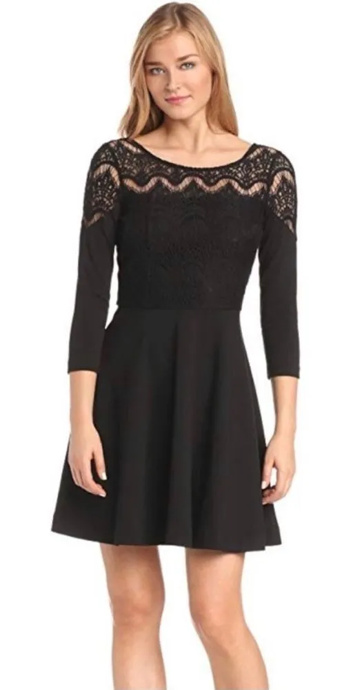 Questions? Leave a comment below! stunning 20 inch 3/4 length sleeve dress with knit lace overlay on... Show more