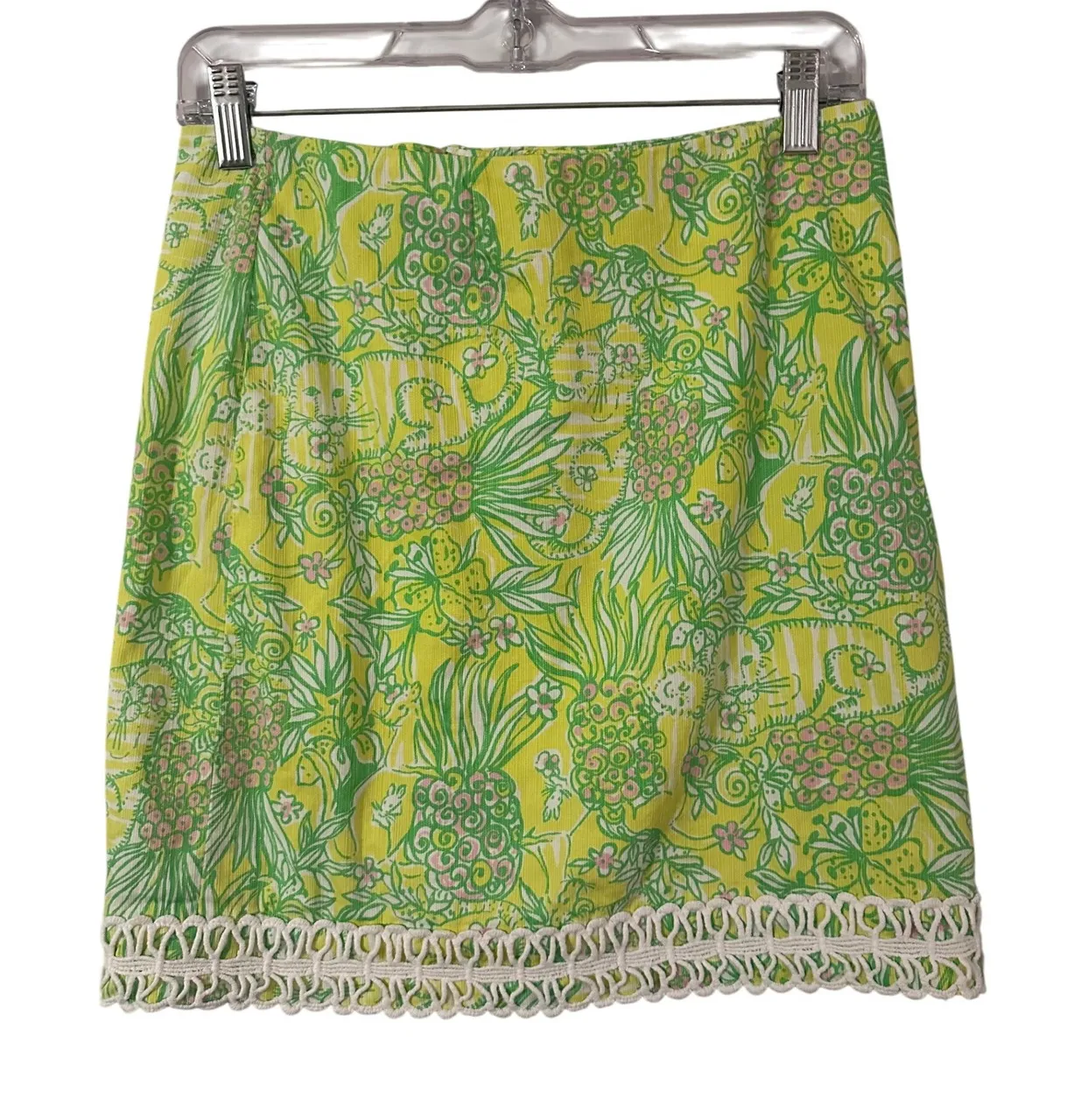 Keywords: Lilly Pulitzer skirt, women's mini skirt, pineapple print skirt, cotton skirt, summer skirt, resort wear, preppy skirt, designer skirt, patterned skirt, cropped skirt, casual skirt, vacation skirt, boho skirt, tropical print, crochet trim skirt