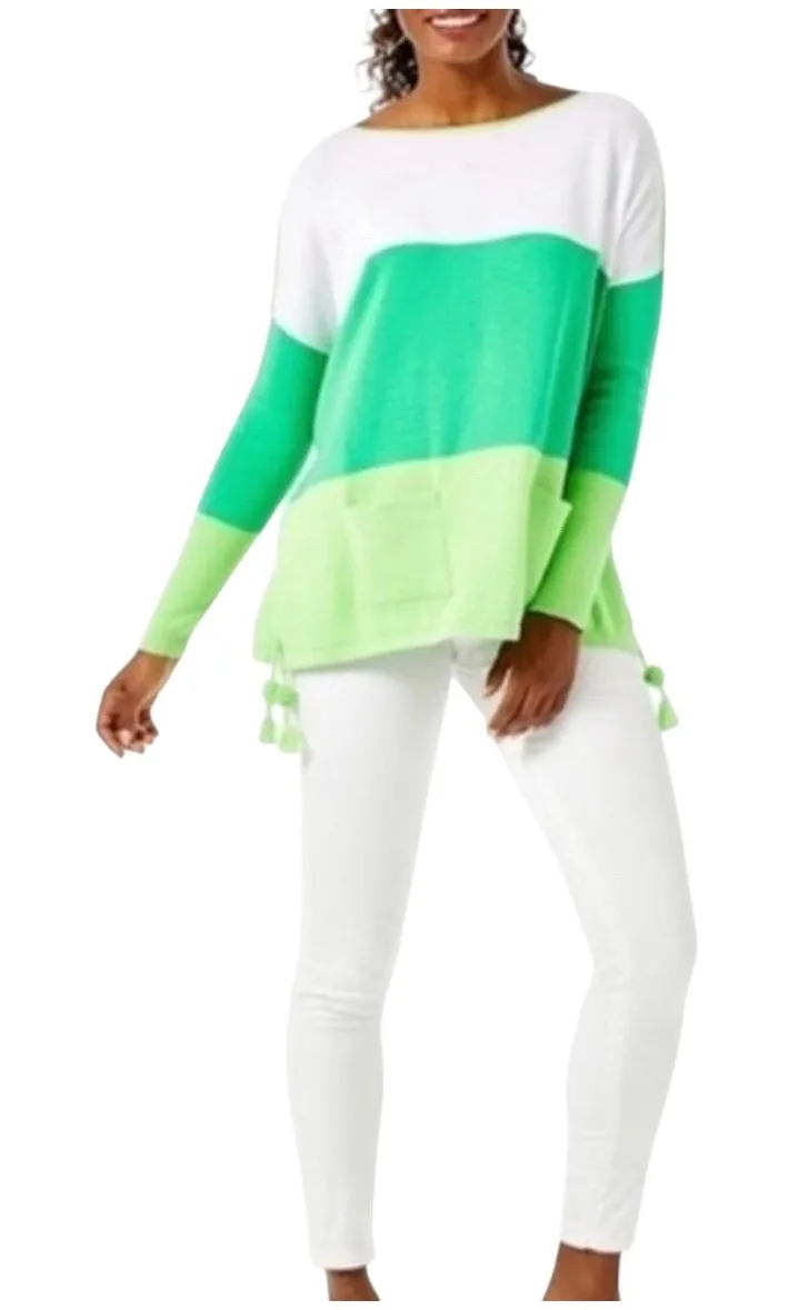 Exuding resort-ready charm, this Lilly Pulitzer sweater boasts a vibrant colorblock design in refreshing shades of green and white. The tunic silhouette drapes effortlessly, creating a relaxed yet stylish look, while playful tassel details add a touch of whimsy.