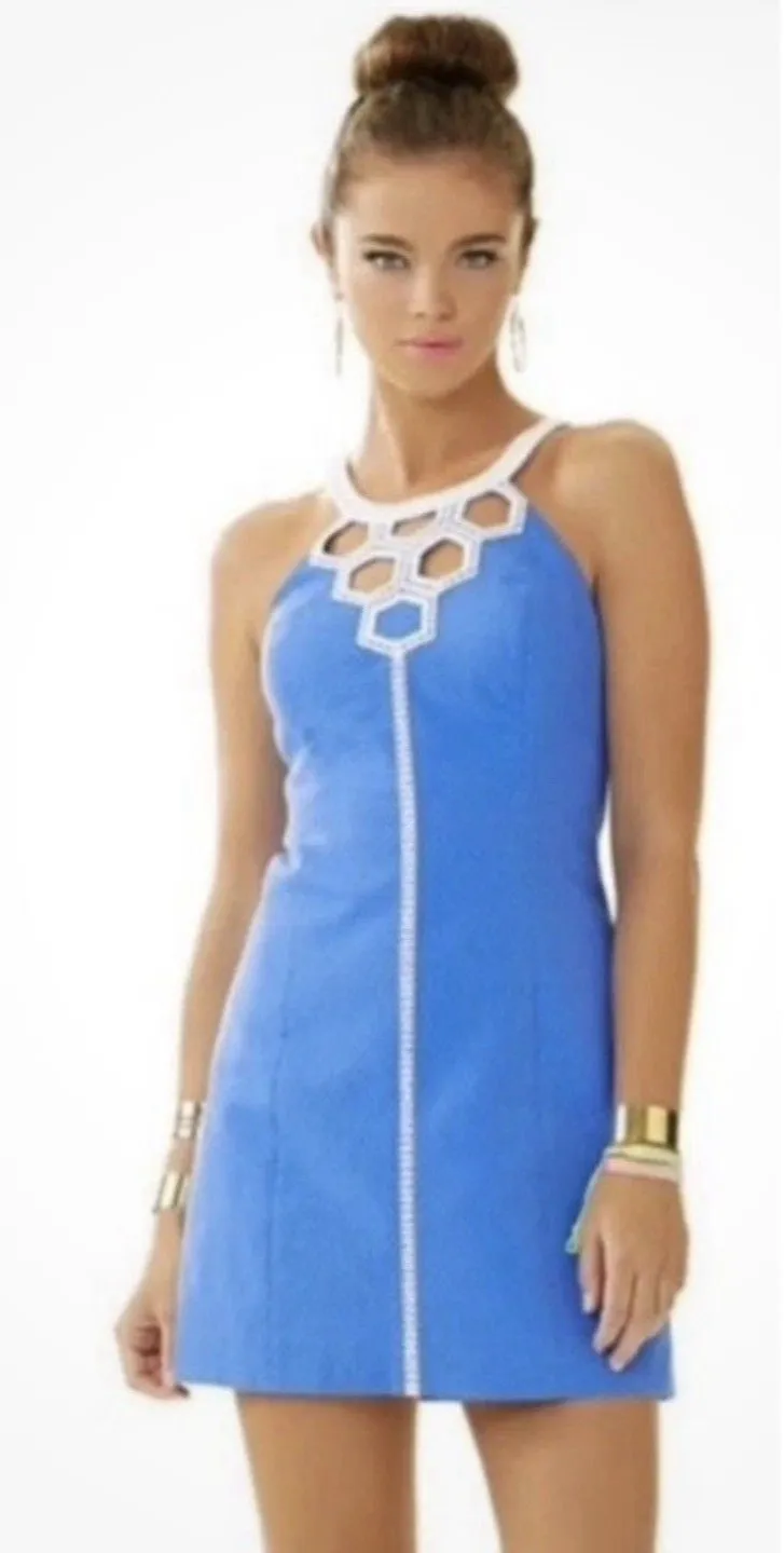 The Lilly Pulitzer Molly Blue White Cutout Hexagon Neckline Lined Mini Dress in size Small (2) is a... Show more