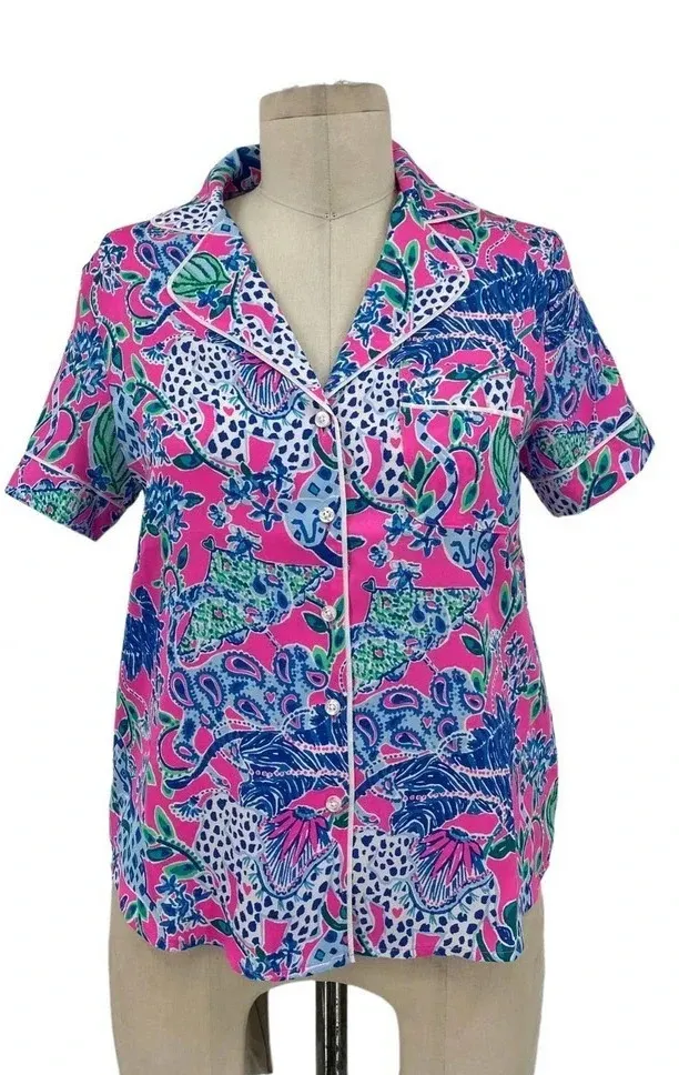 Brand new with tags Lilly Pulitzer PJ Woven Short Sleeve Top Plumeria Pink Untamed Hearts Print A co... Show more