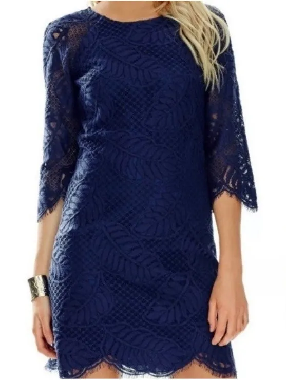 Lilly Pulitzer Rylee True Navy Blue Palm Leaf Lace Shift Dress Lined Women's Size 4 Coastal Beach Tr... Show more