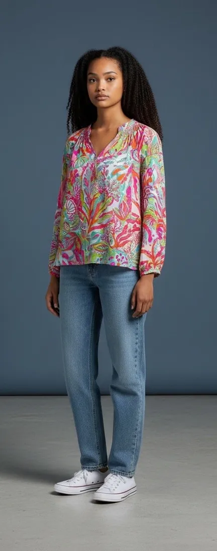 Vibrant Lilly Pulitzer silk tunic top in a stunning coral teal and pink print. This blouse features... Show more