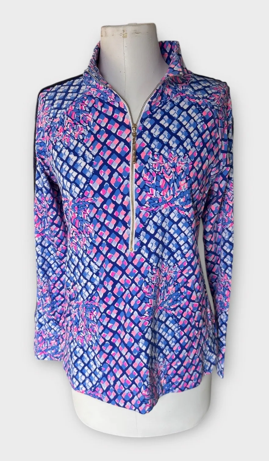 Authentic Lilly Pulitzer Skipper Popover featuring a vibrant blue, pink, and white geometric print.... Show more
