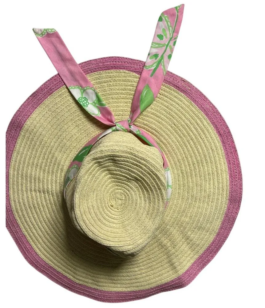 Lilly Pulitzer Straw Sun Hat Wide Brim Pink Trim Floppy Beach Hat Scarf Band Style 33499