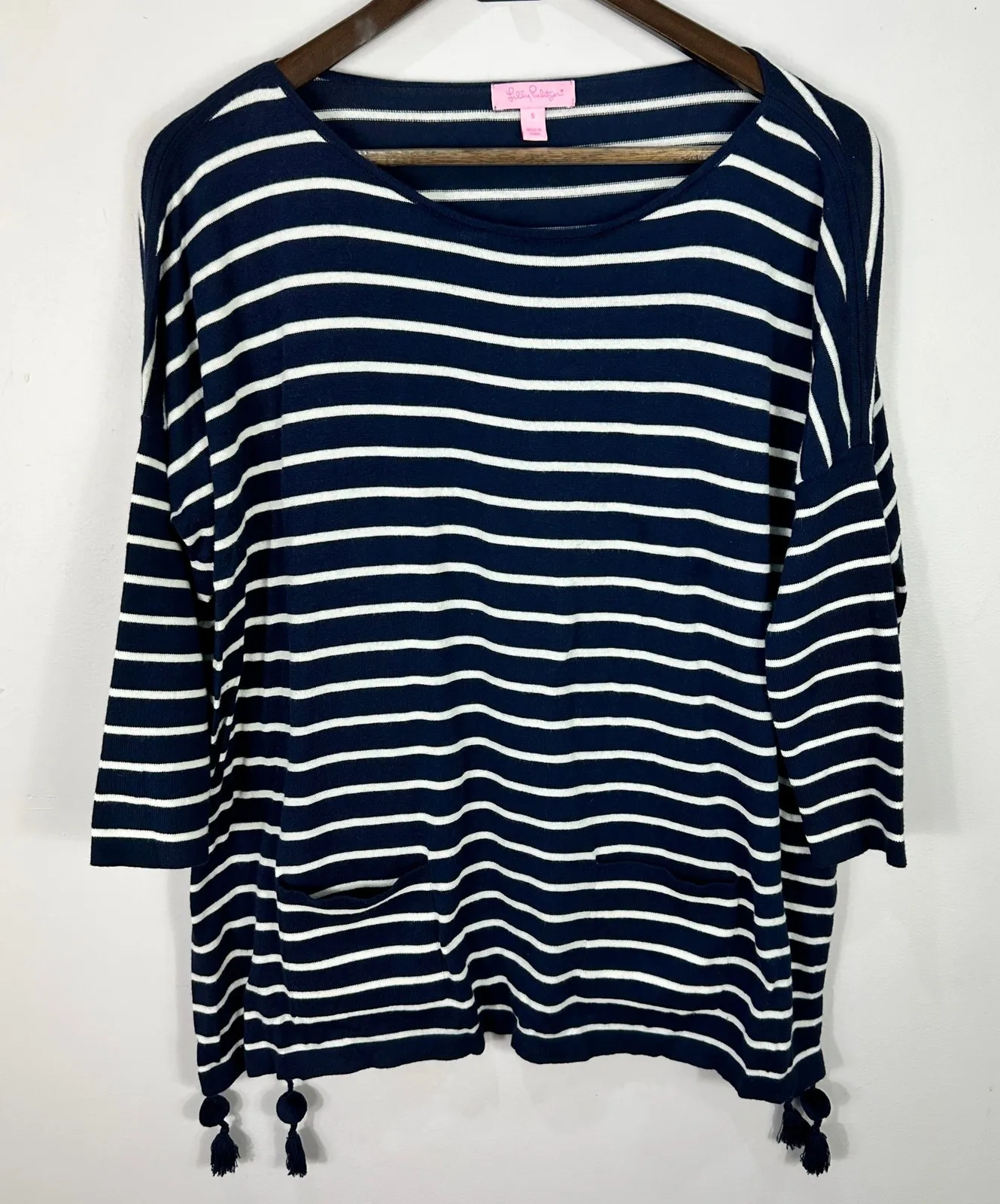 Beautiful Lilly Pulitzer navy and white striped tassel hem top in size Small. Features lightweight s... Show more