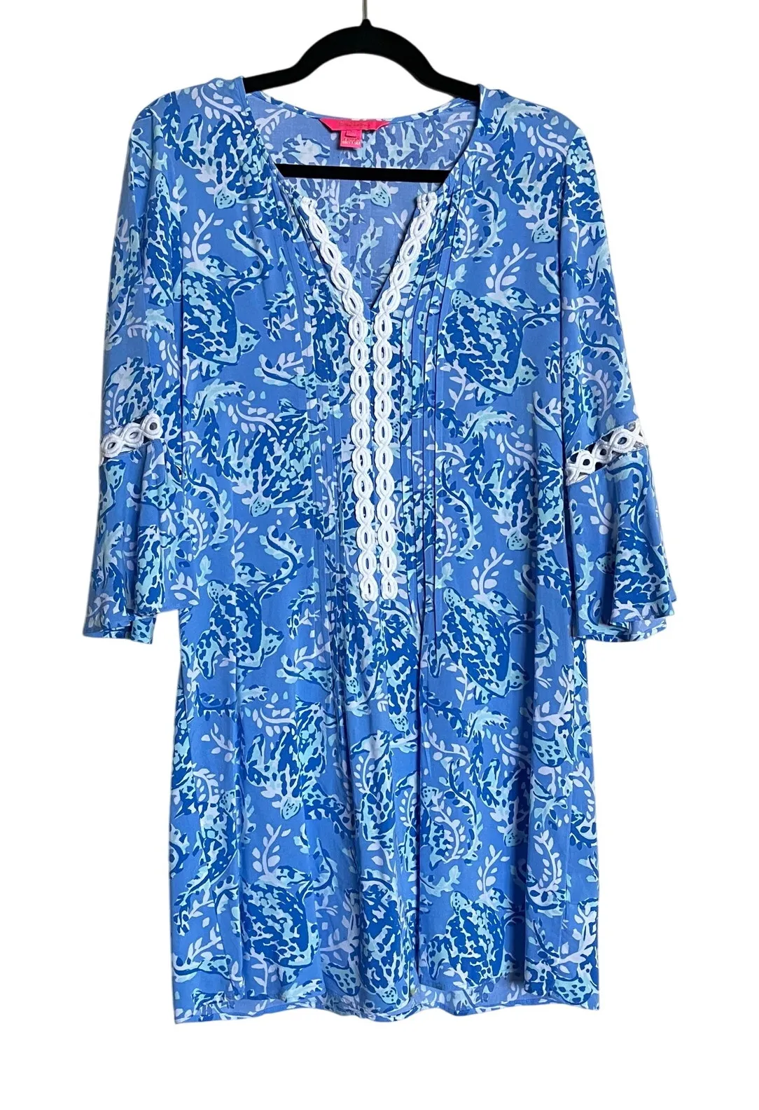 Lilly Pulitzer Hollie Tunic Dress Blue Green Turtle Print White Embroidery at neckline and on sleev... Show more