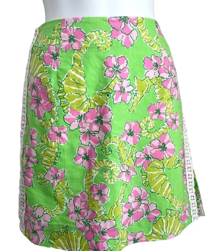 Vintage Lilly Pulitzer seahorse floral print crochet skirt in pinks, greens, and white. The fabulous... Show more