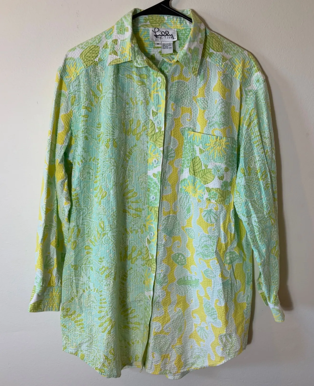 Keywords: Lilly Pulitzer, button up shirt, womens shirt, medium, green shirt, yellow shirt, floral shirt, seersucker, long sleeve shirt, casual shirt, beach shirt, resort wear, coastal style, printed shirt