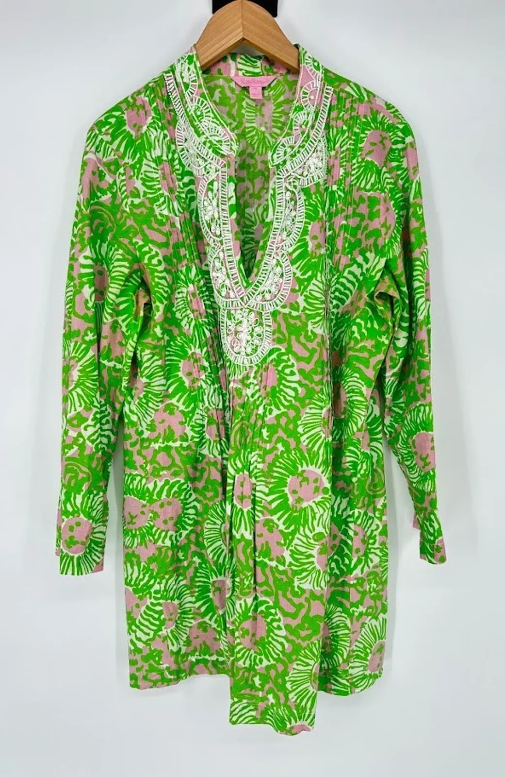 Lilly Pulitzer Womens Sarasota V-Neck Beaded Tunic Top Size Medium Cotton Green/Pink Pullover, 3/4... Show more
