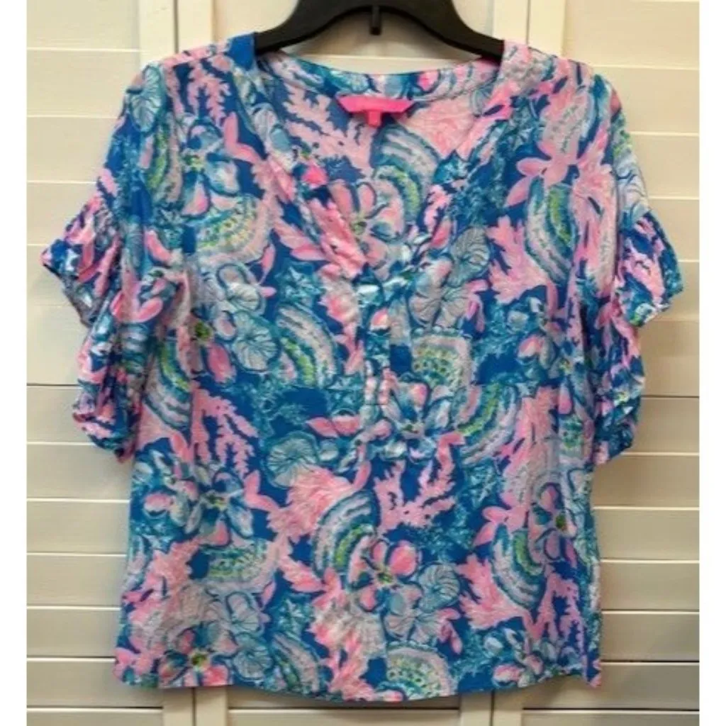 • Lightweight and breathable fabric • Vibrant tropical floral design • Short ruffle sleeves for... Show more