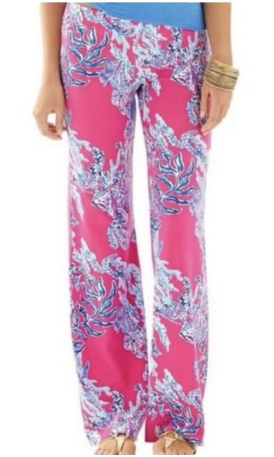 Bright and iconic Lilly Pulitzer pants featuring a vibrant pink and blue tropical coral print. Wide... Show more