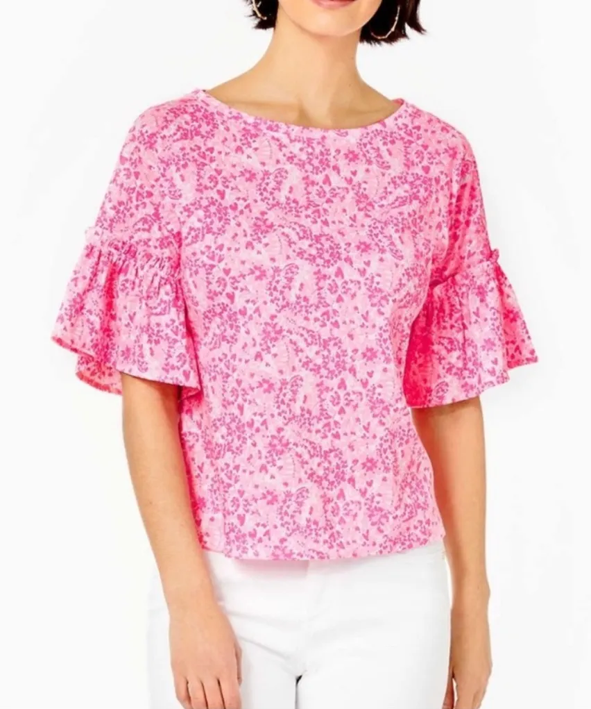 . Bright pink and white floral print top with unique ruffle detail. Round neckline. Loose fitting... Show more