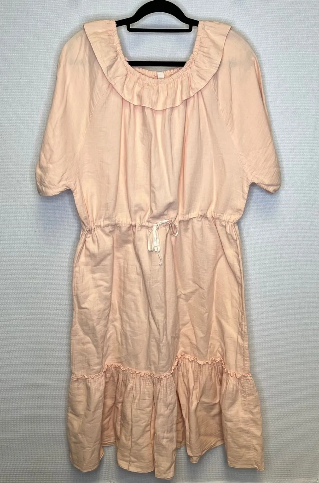 LiLU midi dress in a soft peach hue. This piece features a charming ruffle neckline, short sleeves with elastic cuffs, and a flattering drawstring waist. The design includes a tiered hemline with a delicate ruffle detail. Crafted from 100% organic cotton for comfort and breathability. Measurements: • Length: 49 in Style: Sundress, A-Line Dress Length: Midi Department: Women Sleeve Length: Short Sleeve Pattern: Solid Occasion: Casual Material: 100% Organic Cotton, Cotton Fabric Type: Woven Theme: Bohemian Neckline: Square Neck Season: Spring, Summer Sleeve Type: Flutter Sleeve Closure: Drawstring Accents: Ruffle, Layered Keywords: organic cotton, midi dress, ruffle neck, drawstring waist, tiered hem, cottagecore, boho, loungewear, casual, summer dress, lightweight, feminine, resort wear