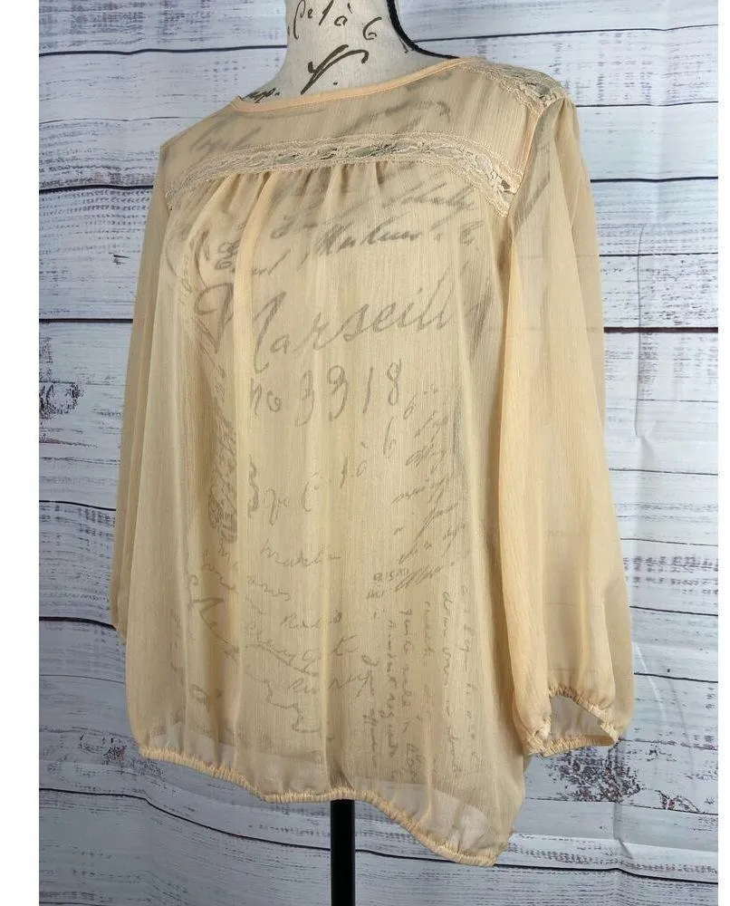 pit seam to pit seam 20.5" shoulder seam to hem 23.5" Add a touch of elegance to your wardrobe with this Lily White blouse. The chiffon fabric provides a sheer and breathable feel, perfect for any season. The collarless design and keyhole neck add a unique touch to the blouse, making it perfect for travel, parties, or casual outings. The blouse comes in a beautiful tan color and features a round neckline with balloon sleeves. The pullover closure provides a comfortable fit, while the regular fit is suitable for all body types. This blouse is a must-have addition to any wardrobe, providing a stylish and versatile option for any occasion.