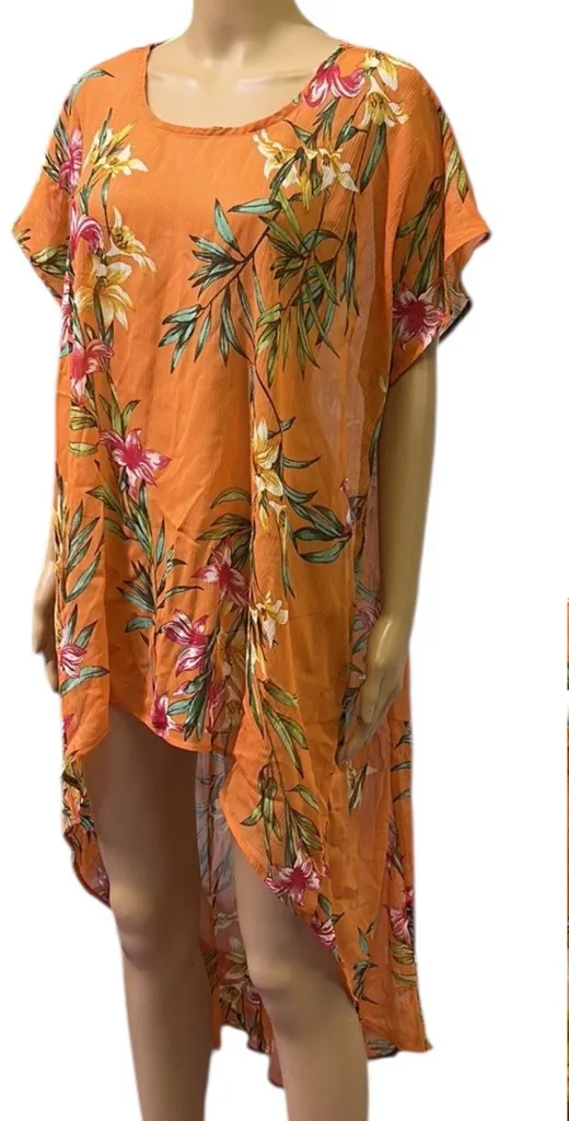 Questions? Leave a comment below! Lily White Orange Tropical Floral Print High Low Tunic Blouse or coverup Semi Sheer Womens Large Very good condition as seen in pictures! Please be sure to refer to pictures for style and check following measurements against something you currently own as most brands, styles or years of clothing size differently. (Example: vintage items were made smaller, preowned clothing may have shrunk..I may have accidentally thought something was womens sizing verses juniors.. the measurements are here for you to have all possible information to base your purchase on.. if theres any additional info you need please ask before purchasing) Measurements are flat across front only not stretched Chest (underarm to underarm) 21” Waist 27” Hips 31” Length (underarm to hem) 21.5” Sleeves (underarm to cuff) 2” Shoulder to hem 27” front 48” back