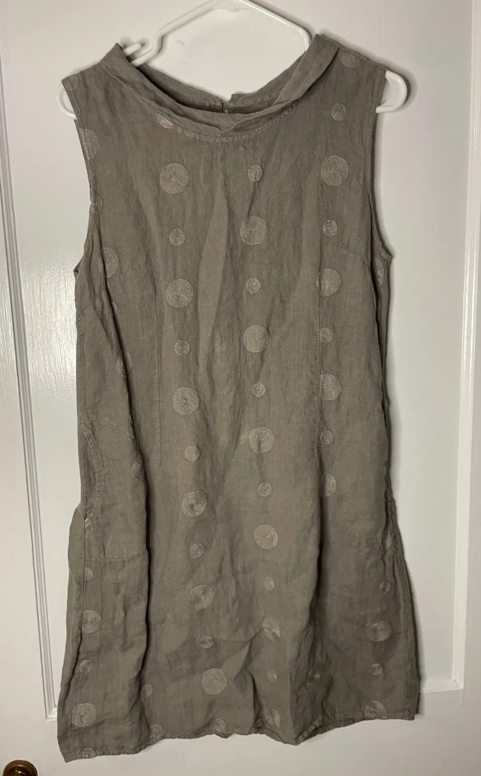 Discover effortless elegance with this Lina Tomei linen dress. The soft taupe fabric, adorned with a subtle circle print, drapes beautifully for a relaxed yet refined silhouette. Designed with a flattering neckline and convenient side panels, this dress offers both comfort and chic style. Perfect for a leisurely weekend brunch or a sophisticated garden party. Measurements: • Bust: 19in • Length: 35 in • Waist: 17 in measured flat Hips approx 22" Has pockets Style: Shift, Sundress Dress Length: Knee Length Department: Women Sleeve Length: Sleeveless Pattern: Geometric Material: 100% Linen, Cotton, Elastane Fabric Type: Woven Theme: Italian, Coins Neckline: Cowl Neck Keywords: linen dress, sleeveless dress, circle print, italian made, summer dress, casual dress, midi dress, lightweight, designer dress, resort wear, prairie dress, linen blend 86