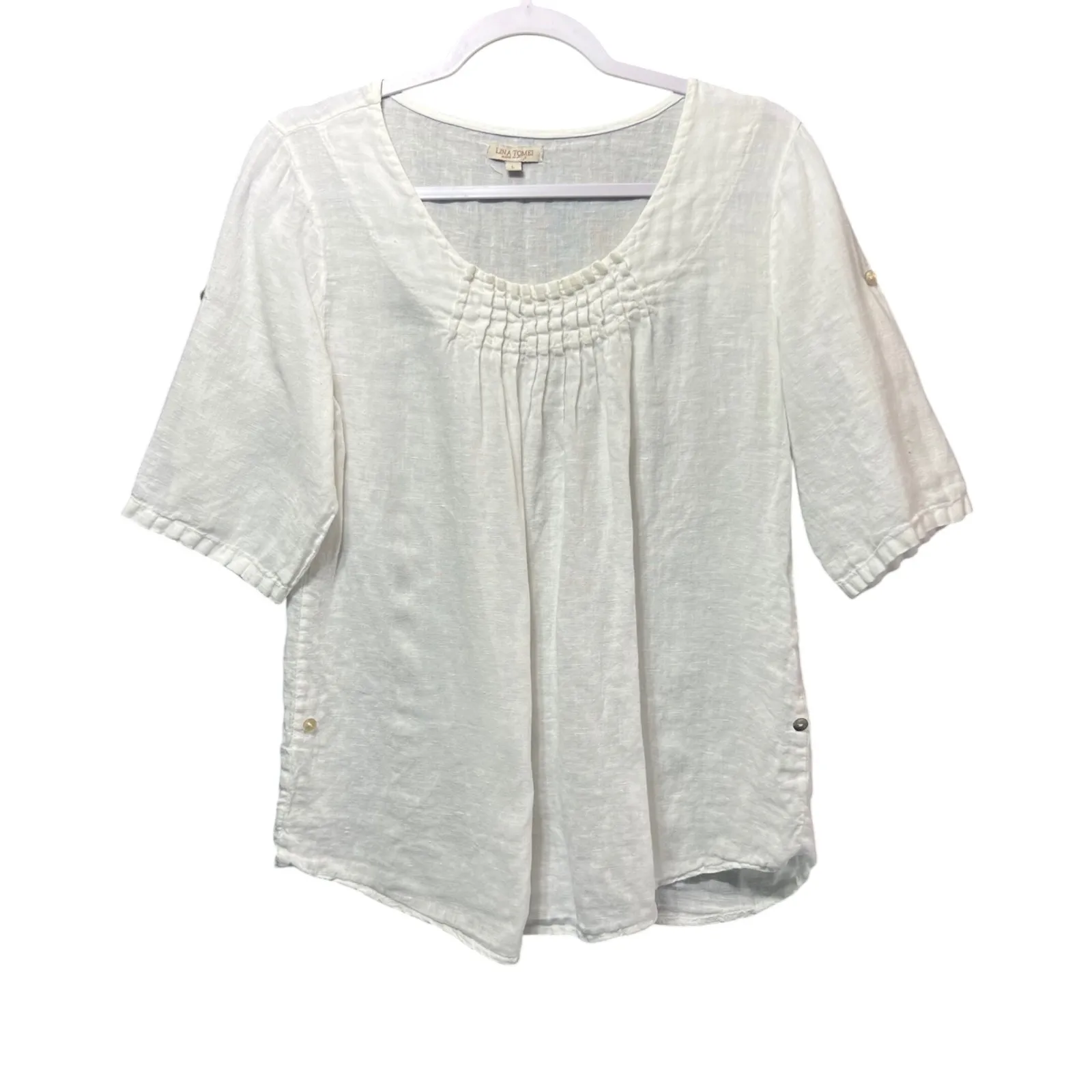A white linen tunic top with a flattering scoop neckline and delicate pleating. This three-quarter sleeve top offers a relaxed yet refined silhouette, perfect for versatile styling. Subtle button details on the sides add a touch of interest to this elegant piece. Keywords: Lina Tomei, white tunic, linen top, scoop neck, pleated details, three quarter sleeve, women's fashion, summer top, casual blouse, elegant tunic, made in italy, plus size, effortless style, breathable fabric, versatile Note: All items are pre-owned with minor wear expected. Major flaws shown. Measurements are approximate.