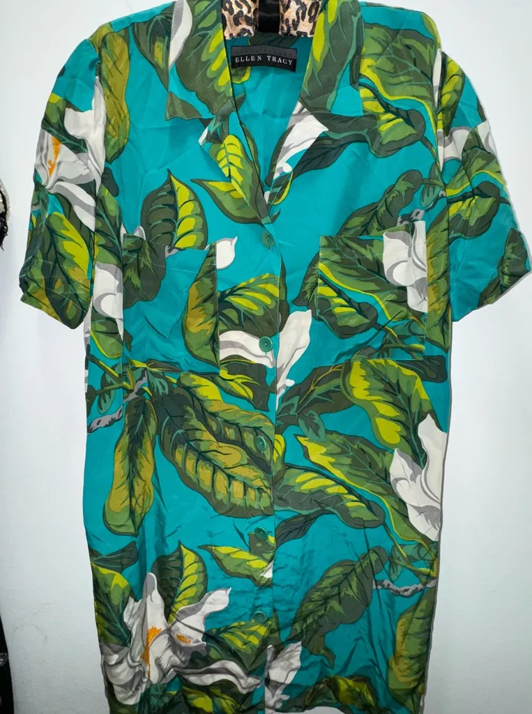 LINDA ALLARD ELLEN TRACY 100% Silk FLORAL Hawaiian Palm Beach Shirt Dress Size 8 Green - $38 - From Sarah