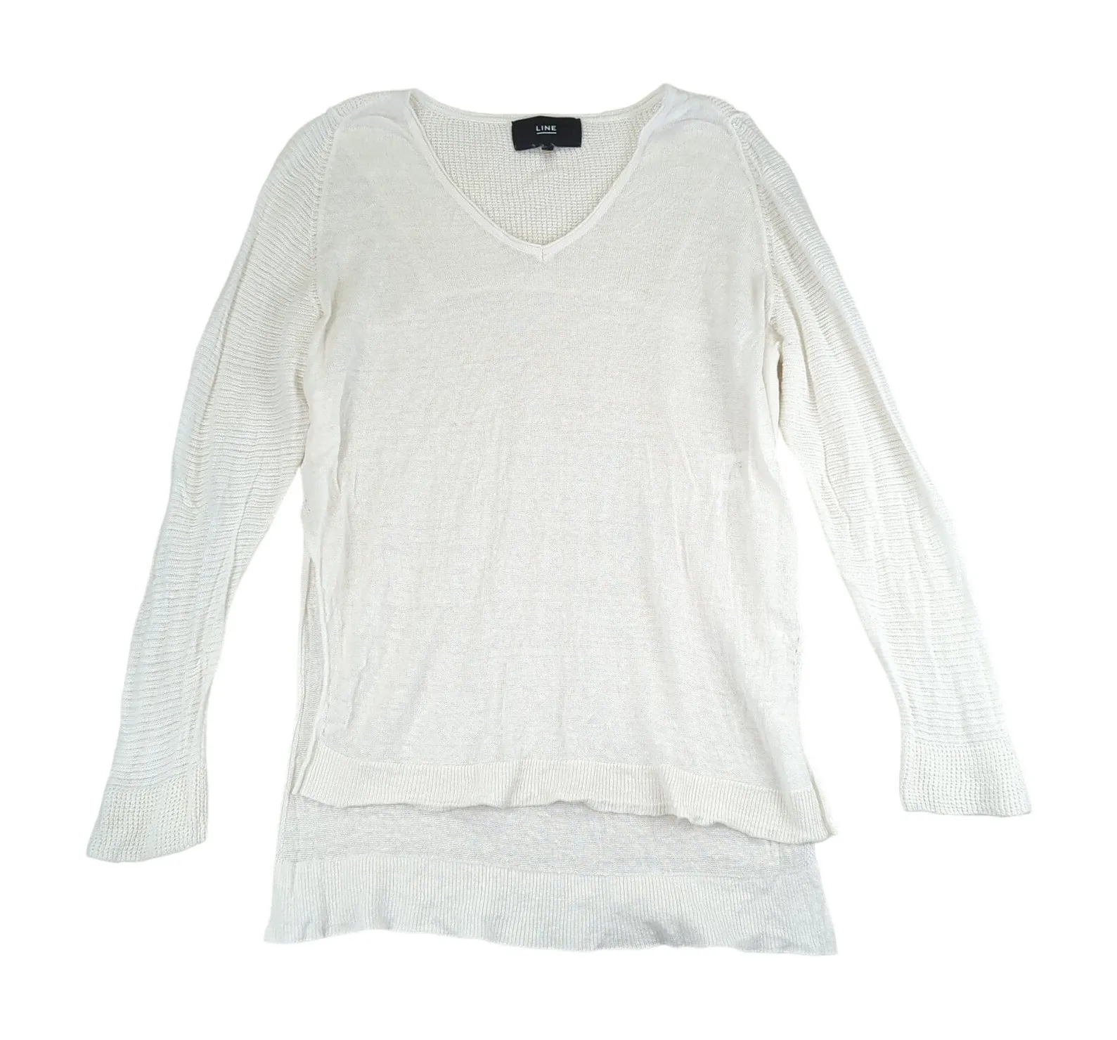 LINE 100% Linen White V-neck Sweater Side Slits Women's Size Small Knit Hi Low In excellent used condition. Flat lay measurements: 20-In pit to pit 27-in length in front 30.5 in length in back. 25.25 in sleeve length