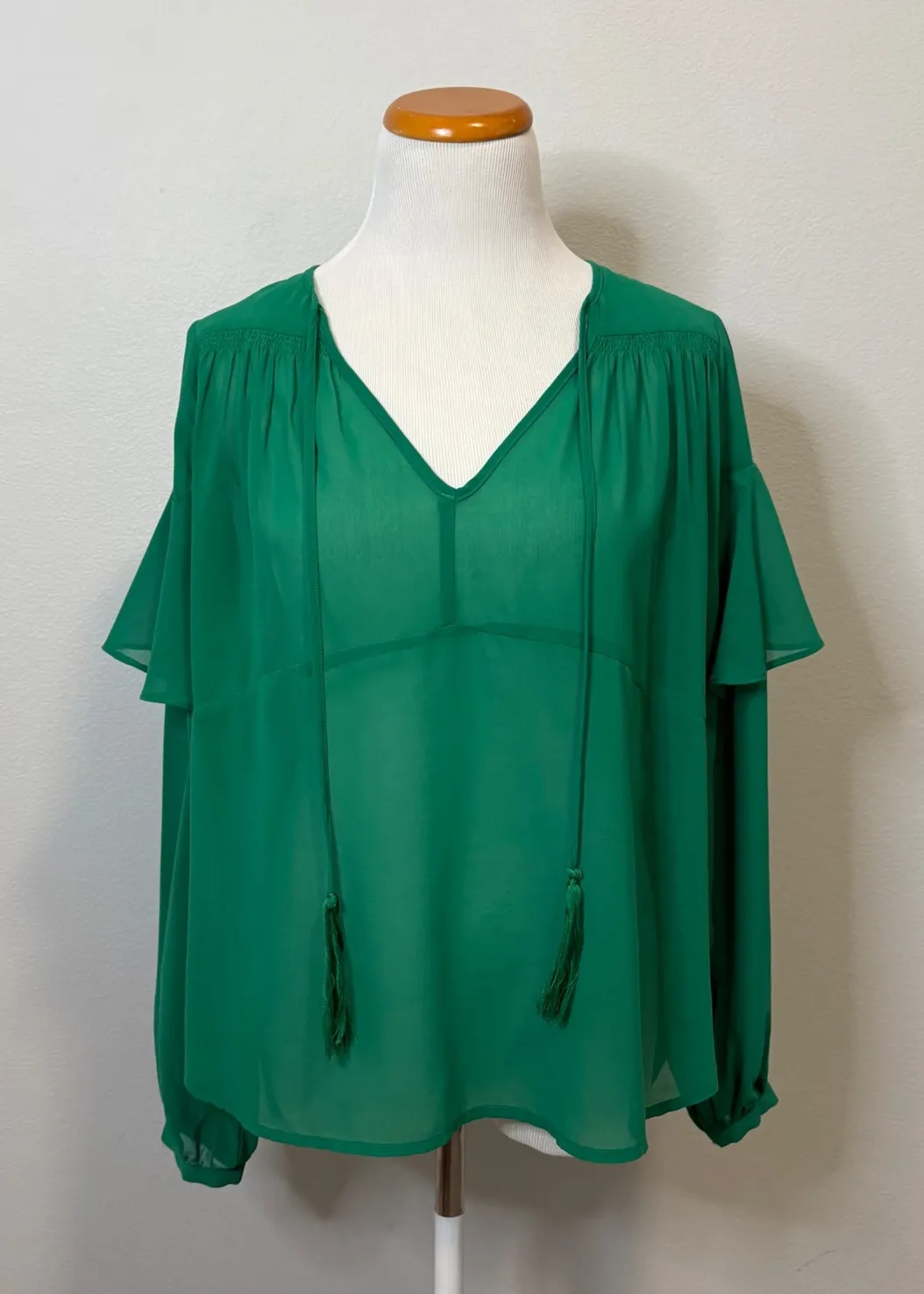 Line & Dot Green Blouse V-Neck Ruffle Sleeve Tassel Tie Sheer XS Emerald elegance unfolds in this L... Show more