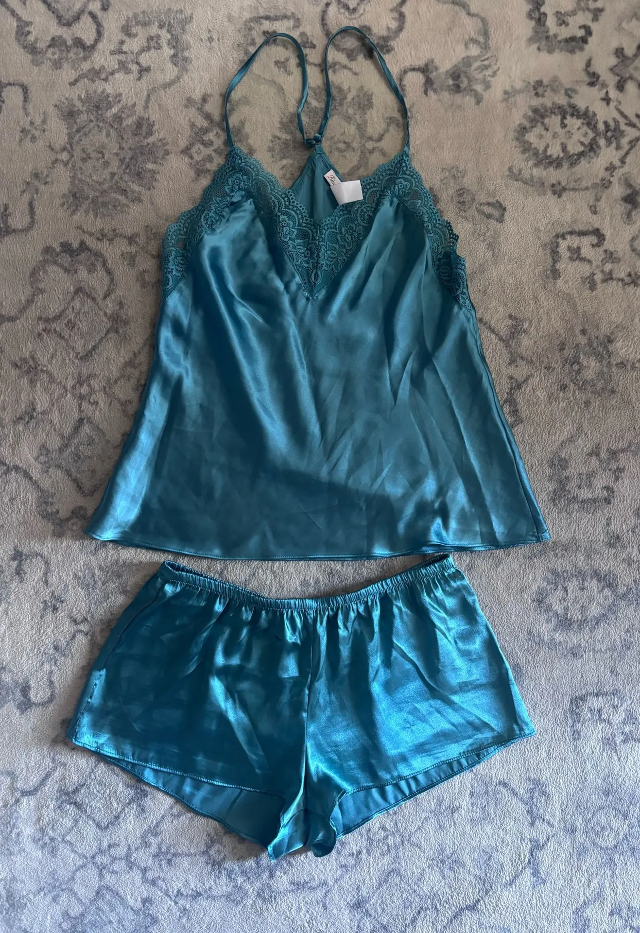 Linea Donatella Teal Blue 2 Pcs Satin Short & Cami Set Sz Medium. Adjustable Straps, Beautiful Lace Accented Front. EUC - $13 - From Mollie