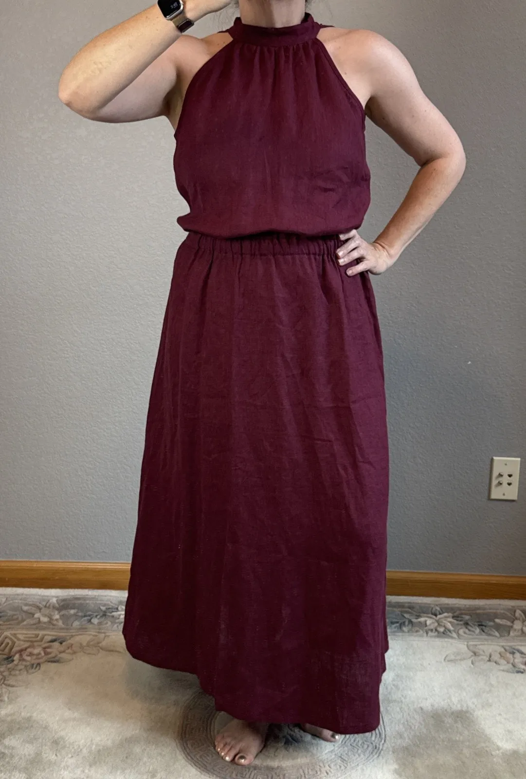 * Measurements (taken flat - unstretched - stretched): * Bust/Chest: 22" * Total Length: 52" All measurements are approximate and taken to the nearest inch. If you need additional measurements, please let us know. Color may vary based on screen calibration and is described to the closest color. high neck, tie neck, side slit, sleeveless, pockets, long, ankle length, maxi, elastic waist, slow fashion, natural fabrics,