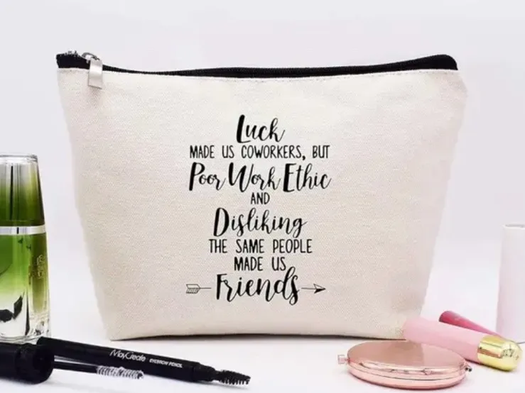 Linen Makeup Bag with Inspirational Quote, Beige Cosmetic Travel Pouch, Unscented Farewell Gift for Coworkers, Boss, Women - "Luck Made Us Coworkers" Sentimental Going Away Present White canvas pouch featuring a humorous black text design. Perfect for organizing essentials.