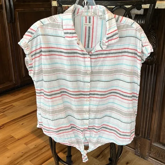 Linen Top Tie Knot Front Striped White Multi Weatherproof Vintage Shirt Womens S - $14 - From Debbie