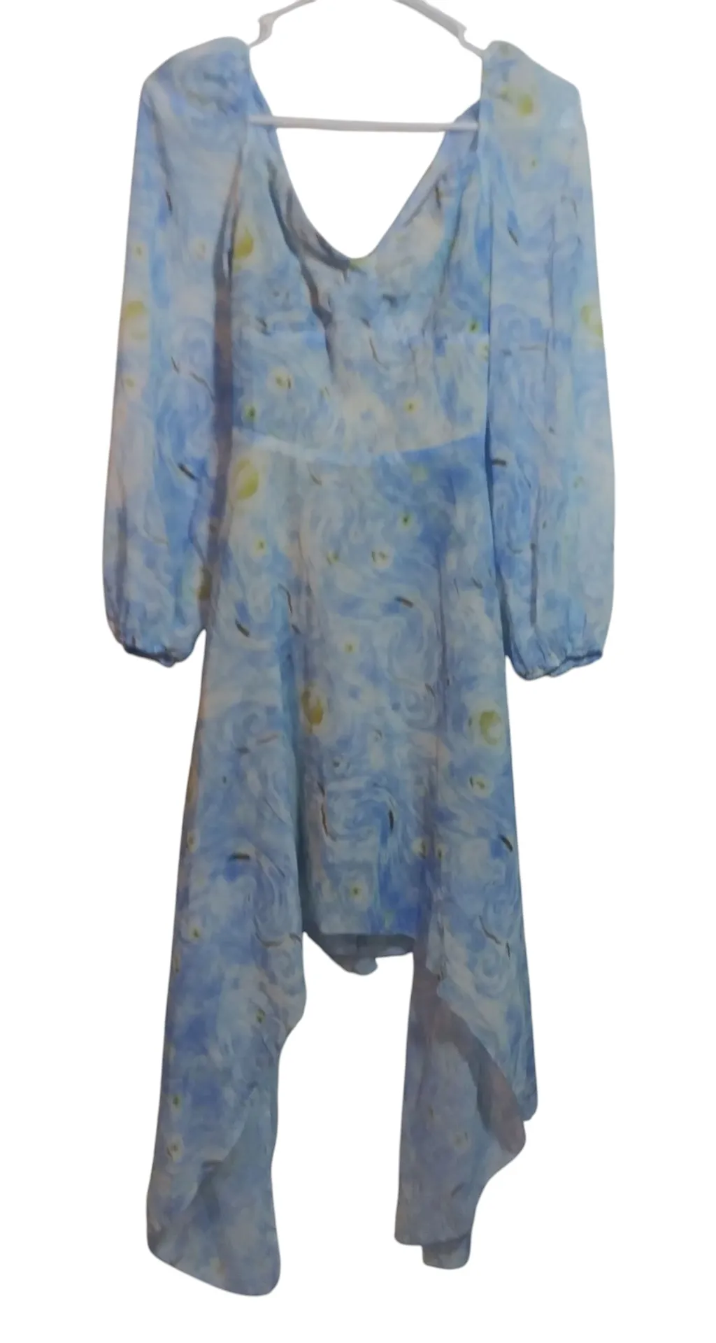 Lingshangfei Starry Night Long Fairy Asymmetrical Puff Sleeve Dress Size Small This elegant women's dress features a beautiful blend of blue and yellow hues, perfect for any occasion. The flowing design adds a touch of sophistication to your wardrobe. Wear your art in this dreamy piece featuring a sweetheart neckline, semi long puff sleeves,trumpet skirt, and asymmetric hem. This dress is covered in a starry night print, it is fitted at the waist before flaring to a billowing skirt, it also has an open back with a functional tie and button! All of this is whipped up from silky and soft fabric. Gently worn No Size tag approximate measurements pit to pit 15" length front 34" length sides 56"