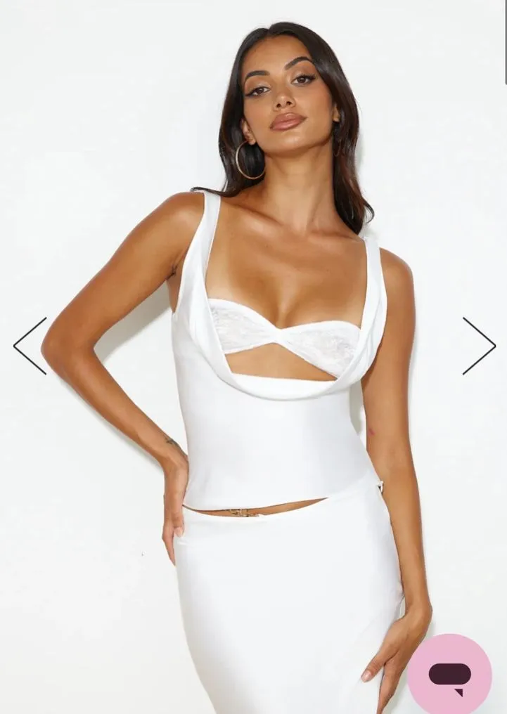 Size XS Sold out Color white Satin fabric. Separate lace bralette, included with Delilah Top. Sc... Show more