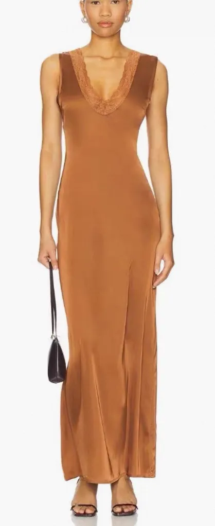 Brand new and size M Sleek copper maxi dress with a deep V-neck. Perfect for elegant occasions.